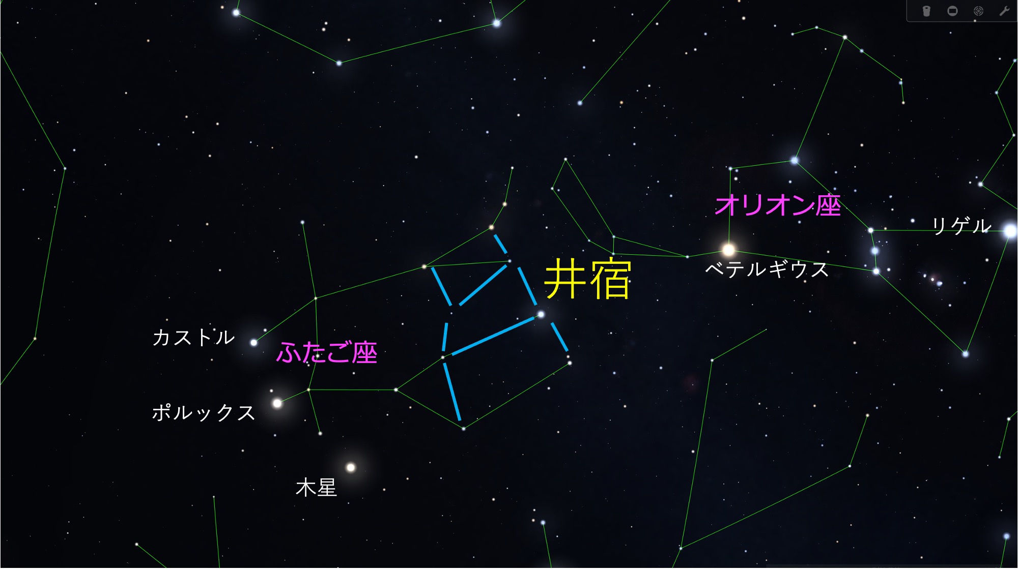 図2 井宿(ふたご座) (ステラリウムを用いて作図) http://www.shibatashinpei.jp/lib/yamashin/899-fig2.jpg