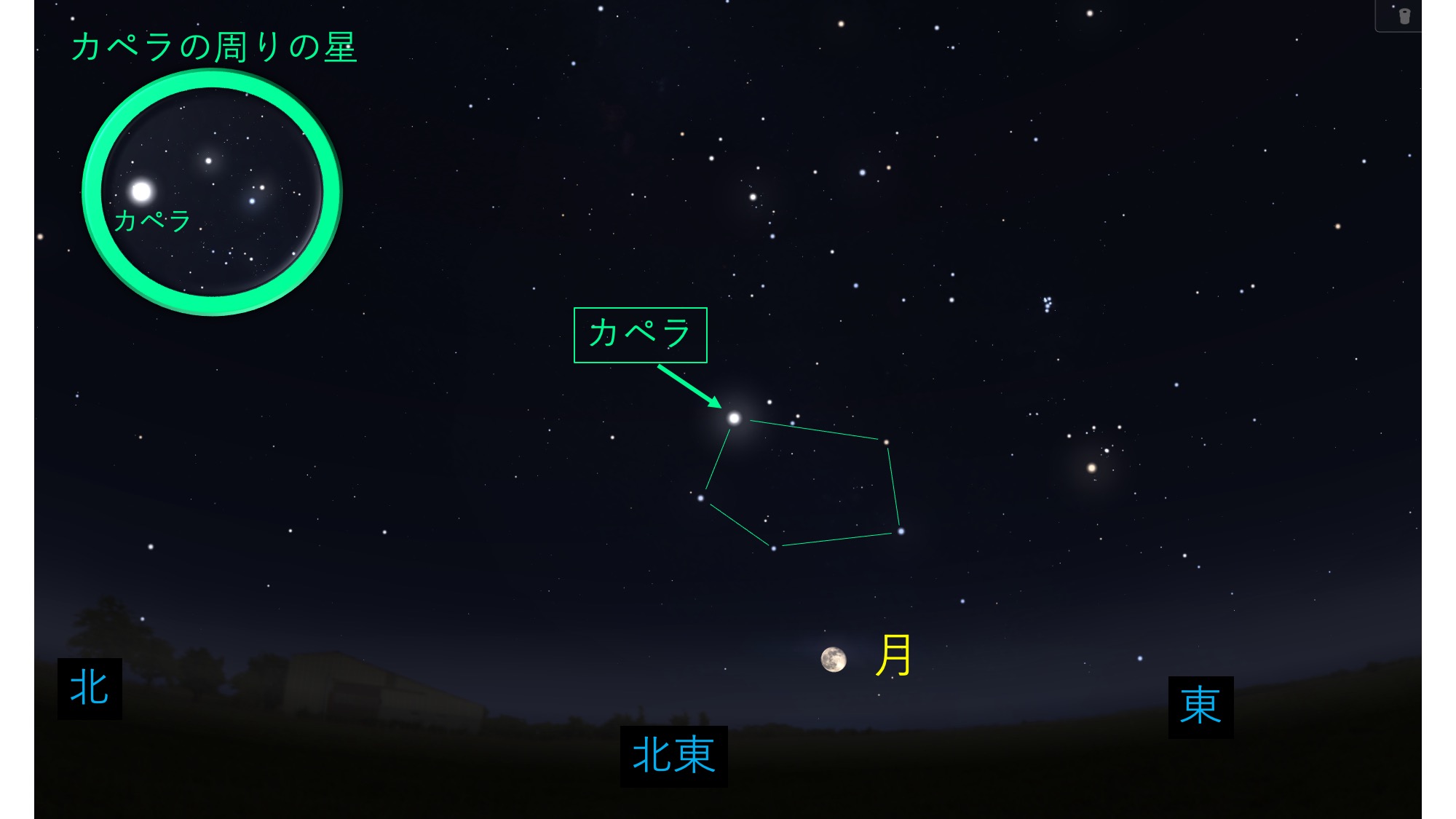 date 2025 12 06 --------------------------- いよいよ冬の賑やかな星々が登場する季節となりました。 出発点となるのは1等星よりも明るい三つの星です。 カペラ、リゲル、シリウスがこの順に昇ってきます。 今日午後6時ごろですと、 カペラは見えますがリゲルとシリウスはまだ現れていません。 ということで今晩はまずカペラを見つけることから始めましょう(図1)。 北東の空に明るい星を見つけたらそれはカペラに違いありません。 カペラは1等星より明るい0等星ですから、大都市の真ん中でも見つけられます。 簡単ですね。 慎重派の方は、 カペラと思われる星の近くに小さな三角が作れたら間違いありません(図1の○ の中)。 今晩は7時頃には満月から少し欠けた「立ち待ち月」が昇ってきます。 8時頃になると木星が昇ってくるので間違えないように注意しましょう。 カペラを見つけたらじっくりその色を味わってください。 織姫星のように白い色でなく黄色からクリーム色がかってみえると思います。 カペラは太陽に似た色です。 カペラまでの距離はたった43光年でとても近い星です。 私がカペラに親しみを感じるのは色や距離だけなく、 名前が「小さな雌ヤギ」を表すラテン語に由来していて可愛い名前だからでもあります。 マツダの乗用車の名前としてご存知の方もおいでと思います。 カペラを含む星座はぎょしゃ座といいます。 御者(ぎょしゃ)はほとんど使われることのない言葉ですが、 現代風にいうとドライバーで、馬車の運転操縦をする人です。 カペラを含む大きな五角形がぎょしゃ座になります。 最後に、カペラの位置に関する重要なポイントを紹介します。 それは、北極星とカペラを線で結んで、南に伸ばすとオリオン座にぶつかるということです。 冬本番になって、オリオン座が真南に昇った時、ぎょしゃ座は頭上付近にやってきます。 南北を結ぶ子午線の上に、オリオン座、カペラ、北極星が並ぶのです(図2)。