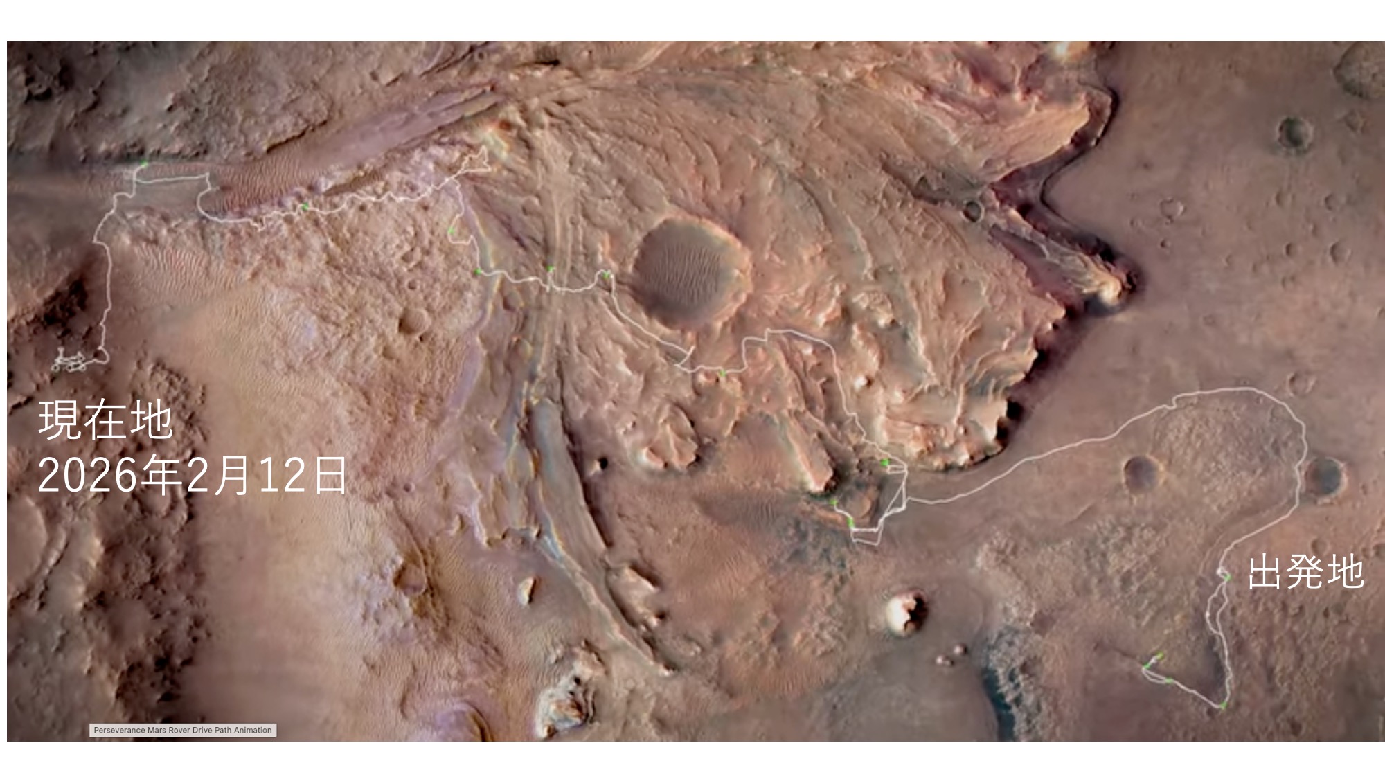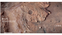 date 2026 02 21 --------------------------- 再び人類を月に降り立たせるアルテミス計画が進んでいることを ご存知の方も多いのでないでしょうか。 単に人類が月に行くだけではなく、 居住可能な施設を作ったり月の資源を利用するなど「月開発」というビジョンのもとに作られた計画です。 さらに、次のステップで火星へ行くことも視野に入れています。 台湾を起点にしてミクロネシア、メラネシア、 ポリネシアへと太平洋の島々にカヌーを使って広がっていった人類の歴史を 見ると火星への進出もありうるのかなと想像してしまいます。 星空案内人養成講座の受講生の皆さんとお話しする機会が多いのですが、 高校生、大学生の若い人たちに聞くと火星に行ってみたいという方が意外と多いのでびっくりします。 とても積極的で、さすが若者は夢が大きいと思います。 火星にはパーサヴィアランスという探査車が2020年以来火星の調査を続けています。 ホームページを見ると毎日のように活動の様子が画像でアップロードされています。 「ああ、今日は穴掘ってるな」など見れるので、 火星がすぐそばにあるもののように感じることができます。 図1のように移動しながら調査を進め2024年までに30km以上も移動しています。 火星は遠く電波で信号を送っても動作が始まるには平均13分の遅れが生じます。 結果の画像が見えるのにもまた同じ時間かかります。 そのため、 あらかじめ画像で進路を調べて計画し少し移動して、また、進路を調べてといった進み方になります。 ところが今年1月30日のNASAの発表によるとAIを使った自立運転で256メートル進めたということが発表になりました。 図2は報告映像で私が感動したものの一つで、火星のつむじ風です(実際は動画です)。 地面が温められて上昇気流ができそれが渦になり、砂埃を巻き上げています。 面白いのはこの時、摩擦電気が発生し、 それが放電して雷のようにゴロゴロ音をたてているのが聞こえます。 電気量は私たちがドアノブでびりっと感じる程度の弱いものですが、 この電気によって大気中で化学反応が起こるのでないかと考えられています。