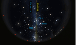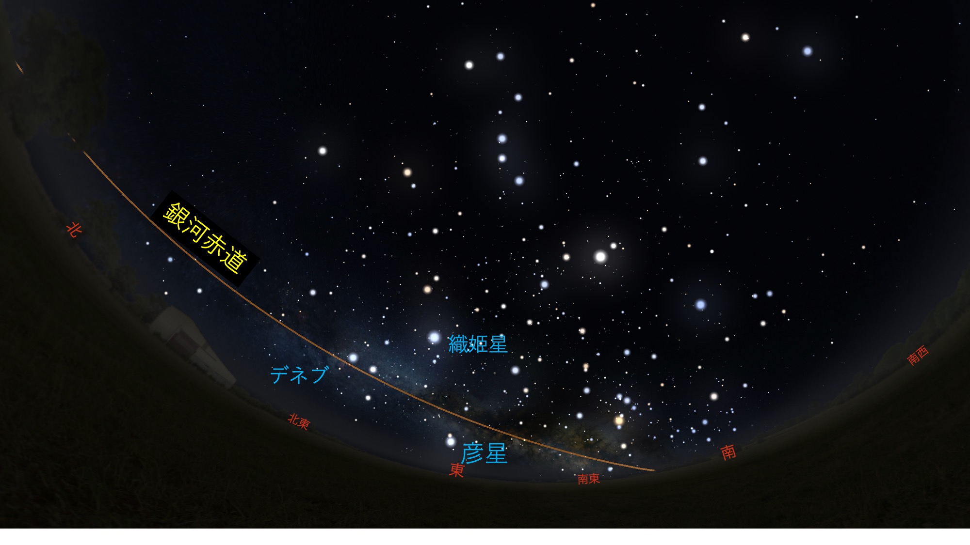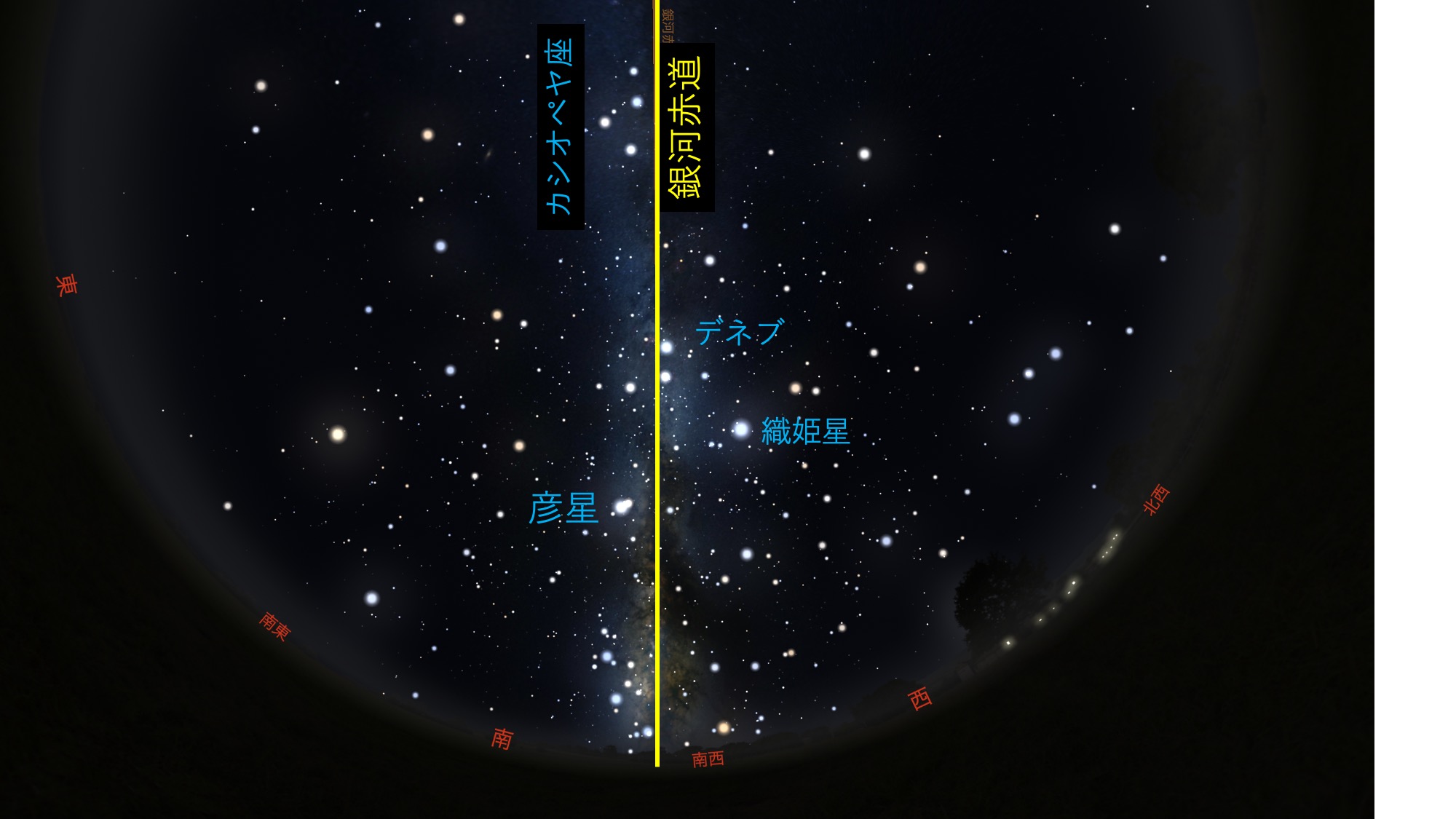date 2025 10 11 --------------------------- 天の川が一番よく見える時期はいつでしょう。 以下の三つの中でどれが正しいと思いますか。 (1)旧暦の七夕の夜だけに良く見える、 (2)旧暦の七夕の前後ひと月程度の間、 (3)いつでも見える。 正解は晴れていればいつでも見えるので(3)が正解です。 それでは、いつでもみえるのですが、 日没後の午後6時-7時頃い見るとして天の川が一番よく見えるのは次のいつ頃でしょう。 (1)7月7日頃、 (2)8月7日頃、 (3)10月11日頃。 正解は、(3)の10月11日頃つまり、今日です。 図1は本日午後6時30分ごろの夜空です。 南西の地平線から始まって、 頭上を通って北東の地平線まで雄大な天の川が見えています。 天の川の中心線は「銀河赤道」と呼ばれますが、それをオレンジ色で示しています。 もう、七夕はとっくにすぎている今の時期に最高の天の川が見えているのですね。 天の川が見えにくい時はどうなっているかというと、 たとえば図2に6月13日午後8時頃の夜空を描いていますが、 銀河赤道が地平線近くを這うように走っています。 このような状態の時は天の川を見るには最悪です。 図1と図2を比較すると、今晩の素晴らしさがわかると思います。 天の川には濃いところ(明るいところ)と薄いところがあります。 一番濃いのは銀河系の中心のいて座付近です。 銀河系は渦巻銀河といって渦巻きの腕があります。 はくちょう座付近も濃いですが、 このような濃いところは銀河の腕に対応しています。