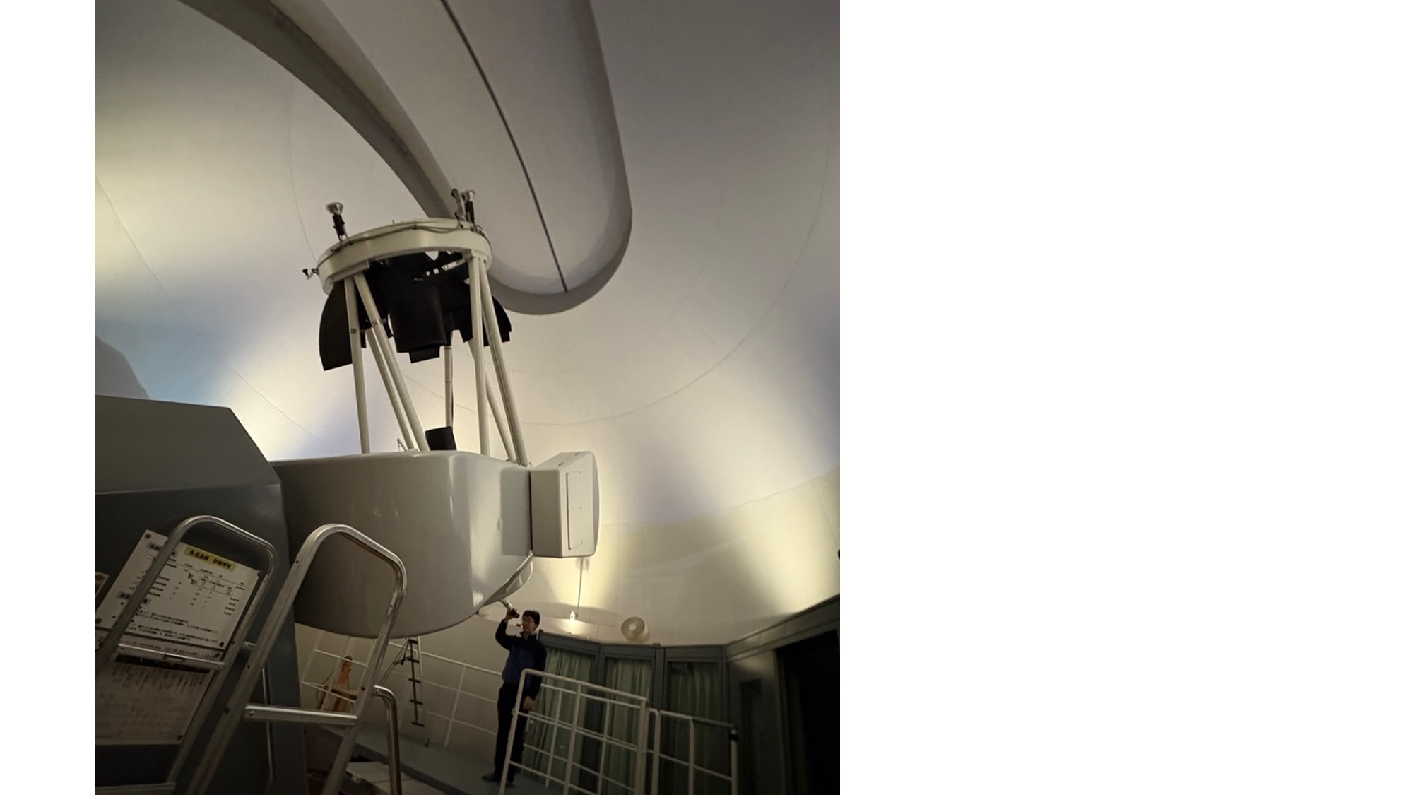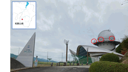 date 2025 11 22 --------------------------- 先日、和歌山県紀美野町にある「みさと天文台」を訪問する機会がありました(図1)。 2006年に美里町は他の町と合併して紀美野町になったのですが、 天文台の名前は設立当初の美里の名前を残しています。 研究員の米澤樹さんに案内していただきました。 天文台の大きさは、 持っている望遠鏡の口径(レンズまたは反射鏡の直径)で競われることが多いですが、 みさと天文台の望遠鏡の口径は105cmもあります。 設立当時市民に公開さてている日本一の望遠鏡の口径が103cmだったそうで、 これを追い抜くために105cmにしたそうです(図2)。 やまがた天文台とつい比較したくなってしまいますが、 山形の主力は口径15cmですのでちょっと悔しいです。 みさと天文台には4次元宇宙シアターやプラネタリウム、電波望遠鏡もあります。 やまがた天文台にはプラネタリウムはありませんが、 4次元宇宙シアターはあります。 一般市民向けの夜の星空ガイドツアーは木曜、金曜、土曜、日曜、祝日に行われます。 完全予約制で料金は1500円です。 年間参加者は約5千人だそうです。 一日平均の来場者数はやまがた天文台と同じくらいですので、 山形は小さい割に頑張っているとひと安心ということろでしょうか。 みさと天文台は色々な工夫をされていますが、 まず、プラネタリウムの星座絵がとても可愛くて感激してしまいました(図3)。 天文台の職員の方が描いたということでオリジナルです。 さらに感心したのは図1の赤く囲った丸にあるにあるプロジェクターです。 高いドーム展望台に登って地面をみると、 見下ろした地面にこのプロジェクターからの映像を見ることができることです。 そこには地面の方向、つまり、 地球を透過して南半球から見える星々が見ることができるのだそうです。 本物の星空とあわせてみると宇宙空間に浮かんでいるように見えるのでないかと想像しています。 今度は夜に訪問したいと思ったのでした。