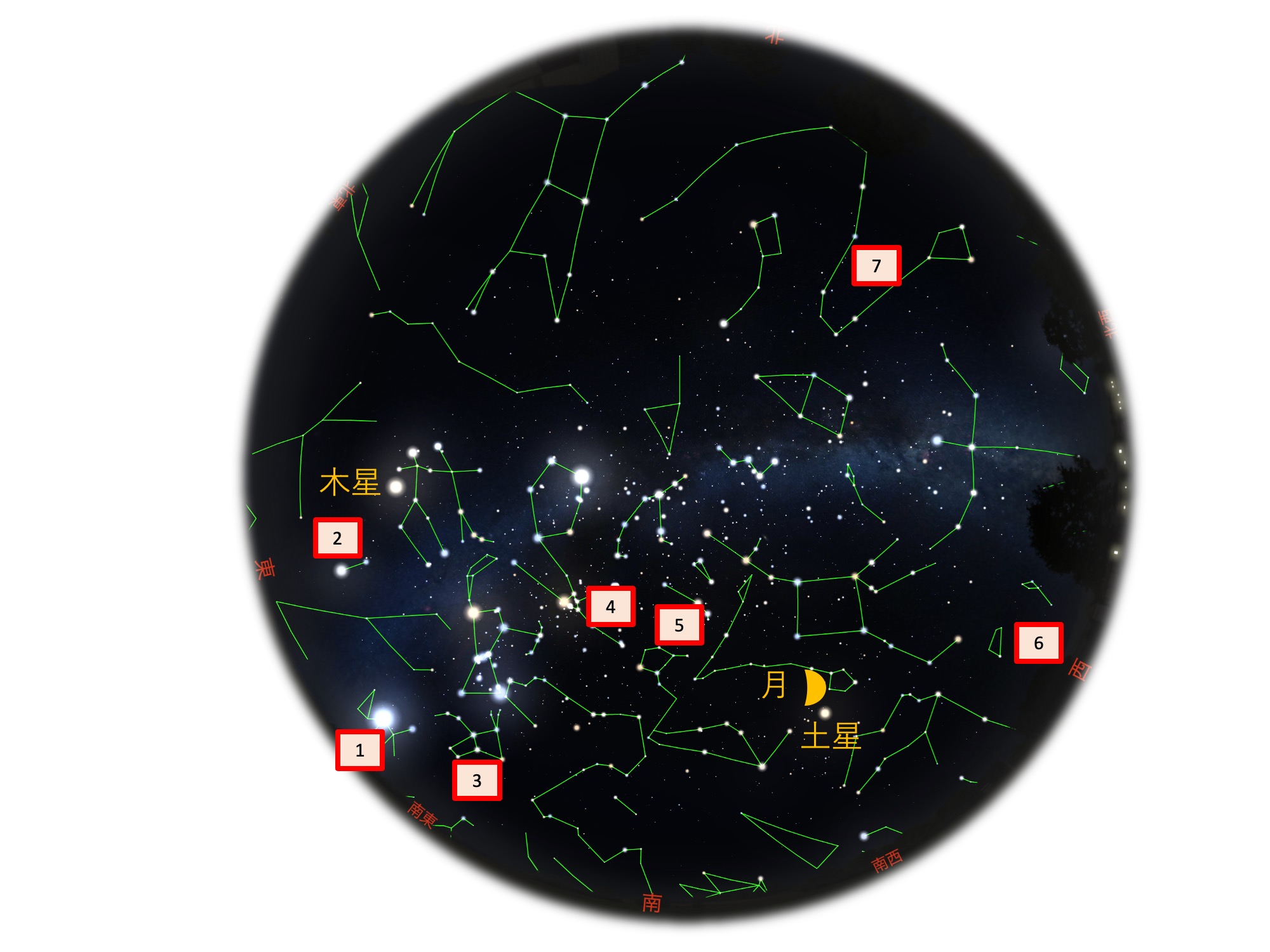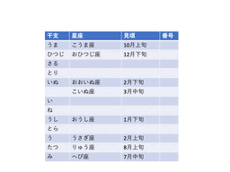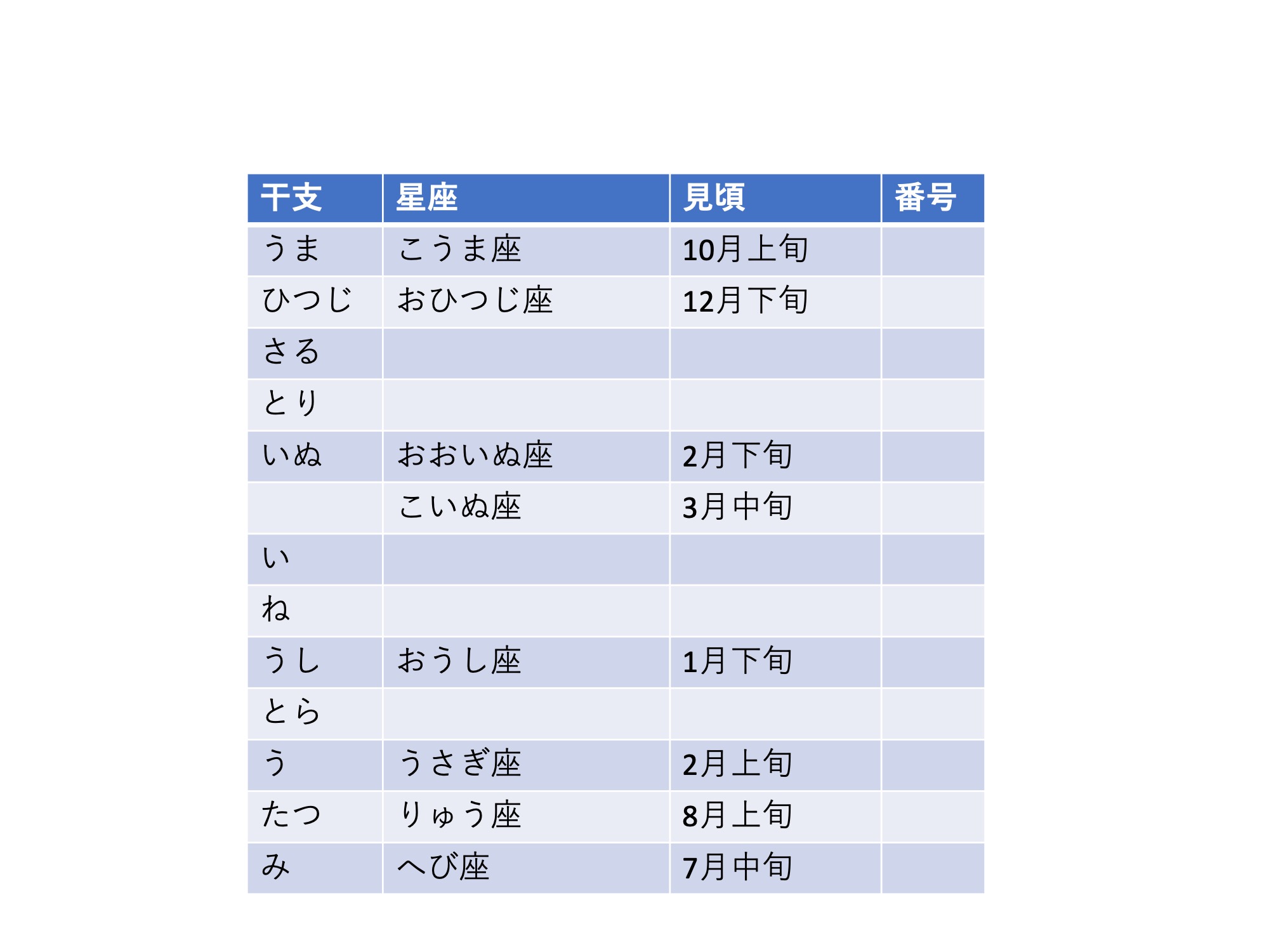 date 2025 12 27 --------------------------- 年末恒例の星座クイズです。 来年の干支は午(うま)です。星座では「こうま(子馬)座」という星座があります。 干支に当てはまる星座を探してリストを作ってみました(図1)。 さて、今晩7時半頃の夜空は図2のようです。 リストに載っている8つのうちなんと7つを見つけることができます。 星座のリストの番号欄に図2の当てはまる番号を入れてください。 一つだけ見えていない星座があるので注意しましょう。