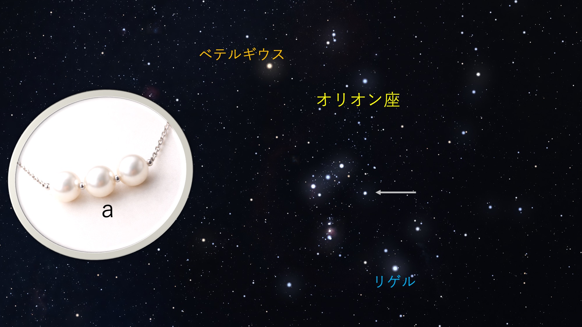 date 2026 02 14 --------------------------- 日が沈んで夜がやってくると南の空高くにオリオン座がまず目に飛び込んできます。 赤みを帯びたベテルギウスと青白いリゲルという二つの一等星に挟まれて、 綺麗に並んだ三つ星が印象的な星座です(図1)。 この三つ星の真ん中の星の名前をアルニラムといいます。 アラビア語で最初のアルは英語のTheに相当する「その」のような意味の定冠詞です。 アルで始まる 日本語になったアラビア語ではアルコールが良い例です。 星の名前ではアルタイルとかアルデバランなどがあります。 ニラムは、別にこの星が睨んでいるように見えるということではなく、 アラビア語で真珠の紐を意味します。 本来は三つ星全体を示す言葉で全体を真珠の紐と見ていました。 現在は三つ星の中央の星(図1のa)の名前としてアルニラムが採用されています。 三つ星の白く光った様子は真珠のようです。 真珠一つより3連になっている方が素敵ですね。 双眼鏡で見ると、 三つ星とその下に縦に続く小三つ星あたりはたくさんの星があって 真珠のネックレスが空に置いてあるようです。 三つ星それぞれに名前があって、左側がアルニタク、 中央がアルニラム、右側がミンタカです。 ついでに、三つ星の右下の図1の矢印の星も名前を持っていて、 サイフと呼びます。 オリオンが腰に小銭入れをぶら下げているわけではなく、 正式にはサイフ・アル・ジャバル(巨人の剣)という名前でサイフとは剣のことです。 ある二択、ある睨(にら)む、見たか?、財布ということでオリオンの星の名前を覚えてはどうでしょう。